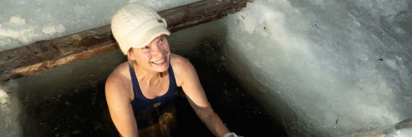 Wood-fired sauna. As hot as you can stand. Then outside — in the snow — to an ice hole carved through the thick river ice. A ladder disappearing into inky black water below.