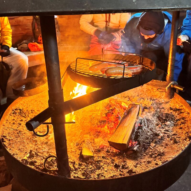 Midway, you’ll pause for lunch inside a traditional kota — a wooden hut rooted in the nomadic tent structures of the Sámi people. Inside, a central fire crackles, offering warmth and a place to gather, cook and share this mornings journey.