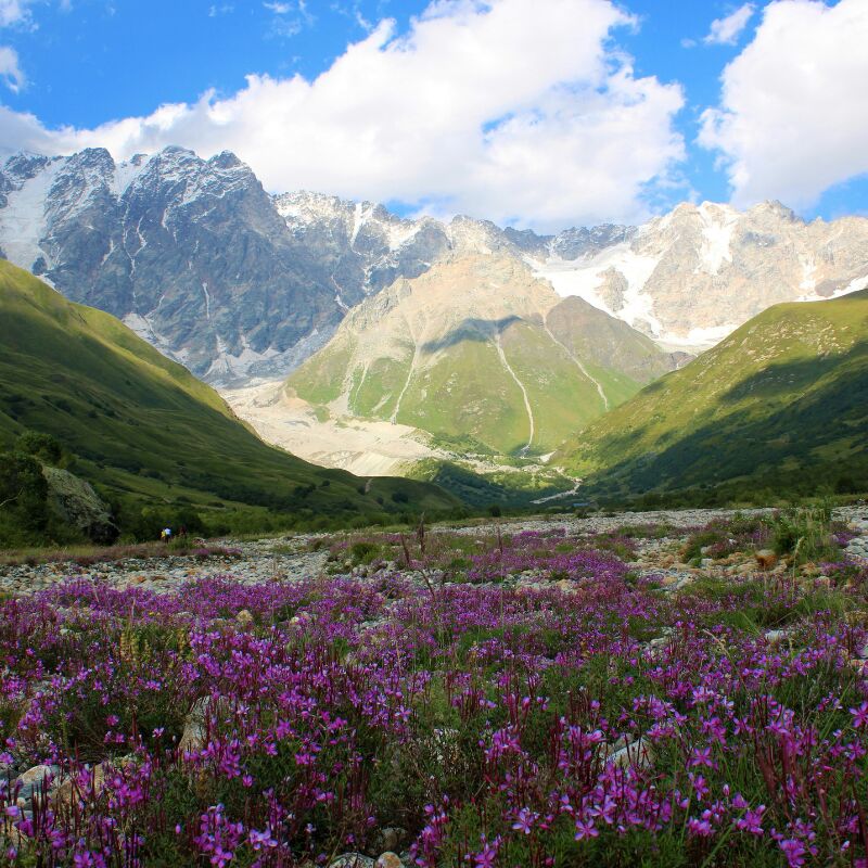 Soon, the immense Adishi Glacier and the towering Mt. Tetnuldi (4,800m) come into view. The trail ascends steadily through alpine meadows and wildflower-strewn slopes towards Chkhutnieri Pass (2,730m), the highest point of your trek. From the top, take in sweeping views of the snow-capped peaks of Tetnuldi and Ushba, often called the “Matterhorn of the Caucasus.”